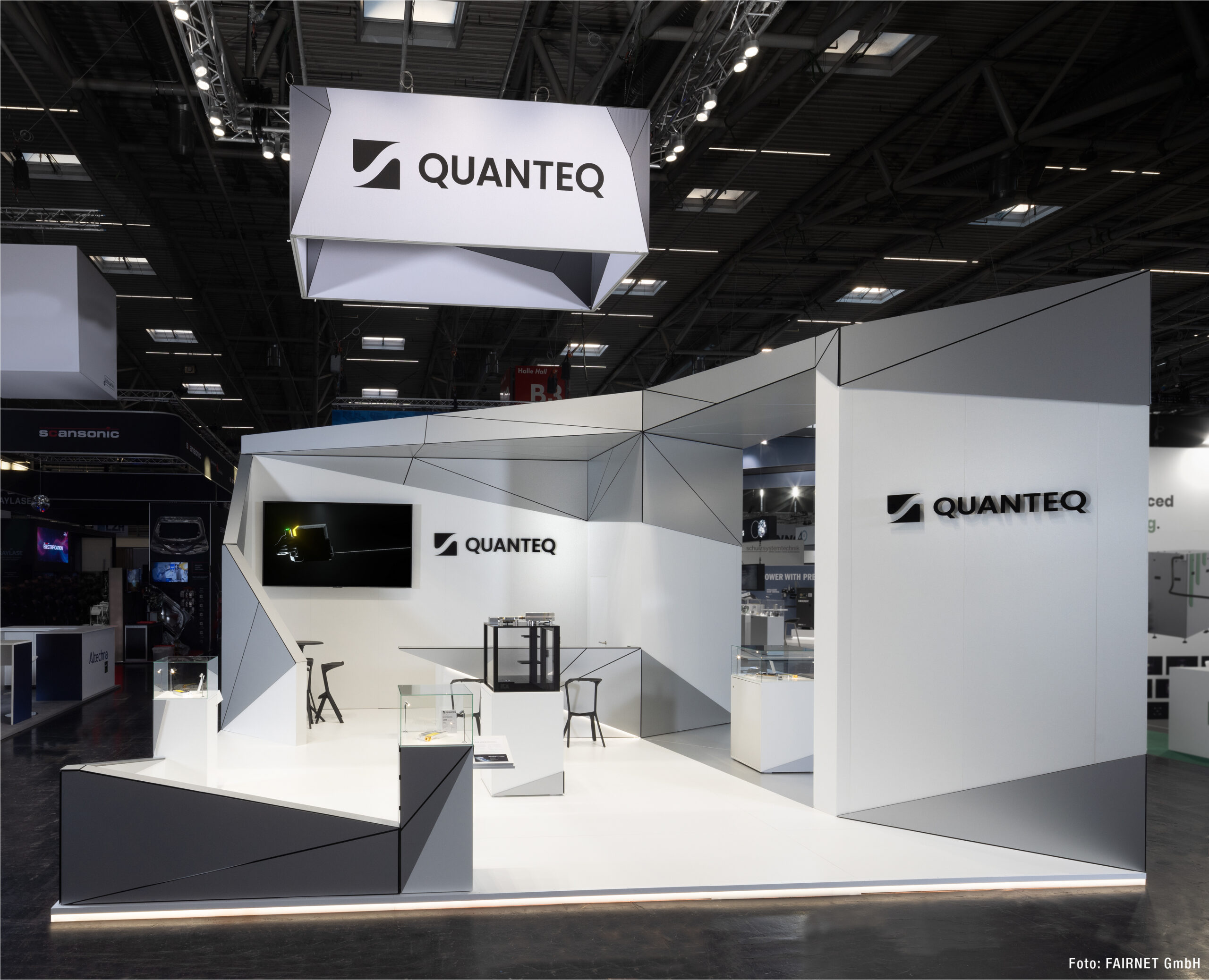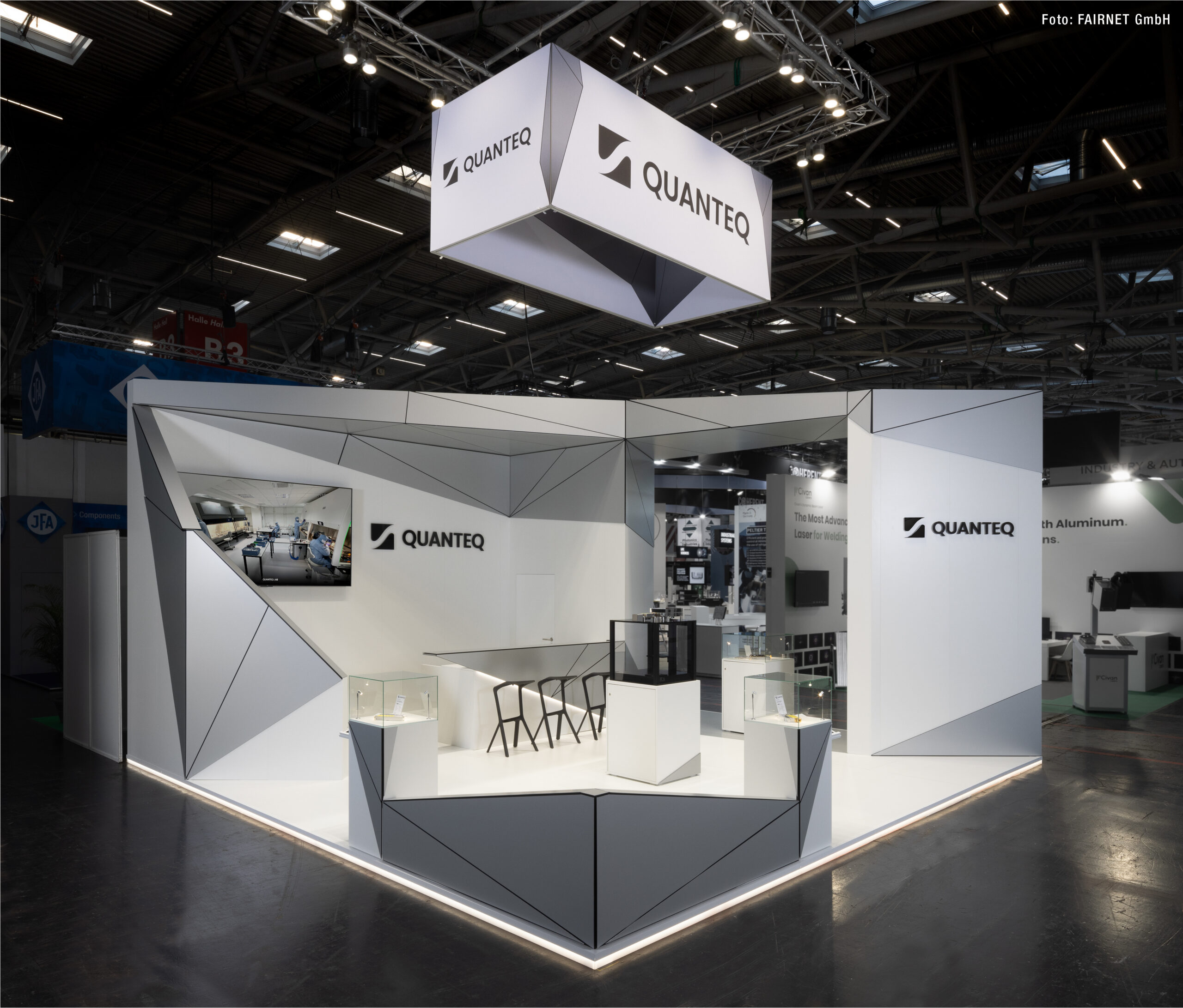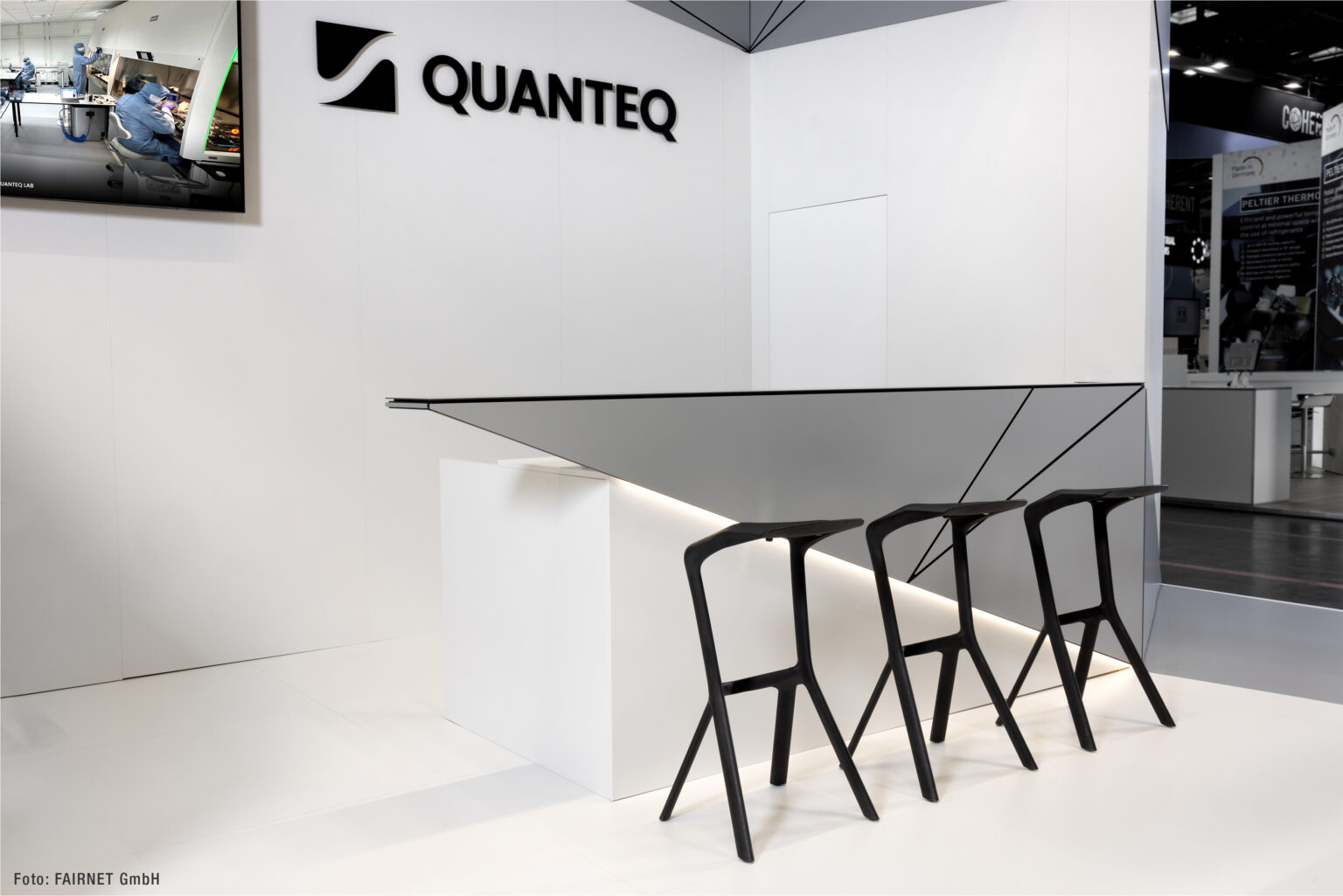 When we were commissioned by Quanteq to develop a trade show booth concept for the “Laser World of Photonics 2025” in Munich, we faced the challenge of creating both a perfect stage for their product and a dynamic space for interaction. The team at Quanteq, a company that develops and sells the world’s most compact high-performance lasers, had a clear requirement – no compromises.